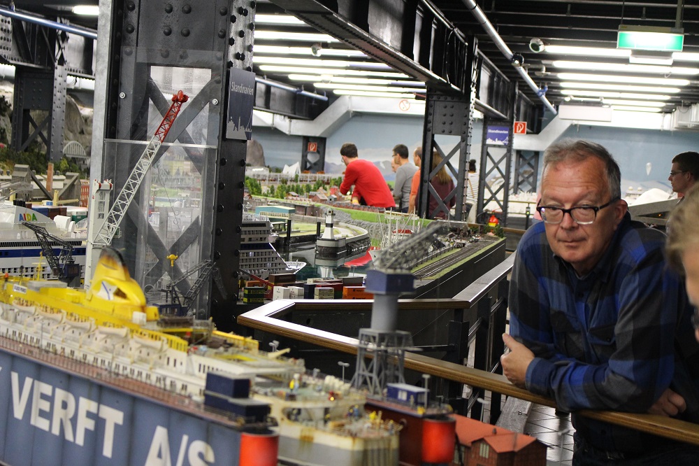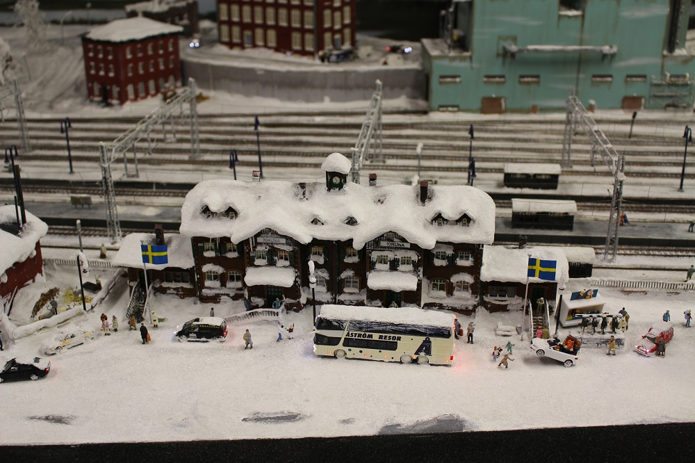 Det finns hur mycket roliga smådetaljer som helst bakom kulisserna också. Den roligaste detaljen tycker jag var pingvinerna som var på semester. De står på perrongen på Kiruna station med resväskor och allt. Hela anläggningen kryllar av såna här små detaljer. En annan scen är en gubbe som sågar ner ett träd, det faller lite olyckligt genom taket på huset och då kommer frugan ut och skäller på honom. Stora delar av Hamburg är avbildat. Bl.a. så finns en jättefin modell av konserthuset. Trycker man på en knapp vid kanten så spelas klassisk musik upp och huset delar på sig. Inuti huset så ser man scenen, musikerna och publiken. Man ser hur musikerna rör sig när de spelar!