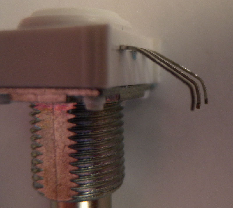 Potentiometerns anslutningar böjs snett neråt och de sista millimetrarna viks lodrätt ner.