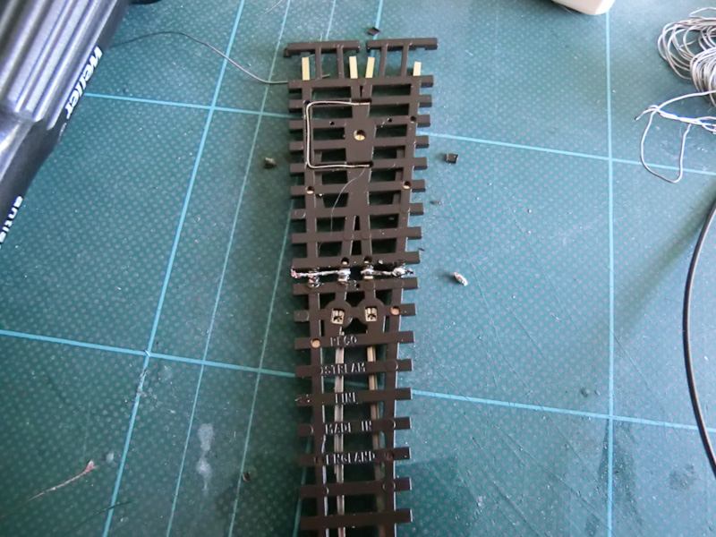 Det sista jag gjort på modulen är att jag arbetat med växlarna och modifierat dem för DCC enligt instruktioner på internet och Herr Boströms hjälp. Bilderna nedan visar några av mina eskapader med lödkolven och lössågen. På den vänstra bilden ser ni byglingarna som jag lödat dit på undersidan av rälsen, högra bilden visar både byglingen och kapningen. Som ni även ser fick jag några små skador på de andra rälerna men det är inte djupare än att jag kan ordna till det med en fin slipkloss. Till höger kan man även ana strömförsörjningen av hjärtbiten (gul sladd) som kommer kopplas till växelomställaren under modulen. Huvudrälerna kommer strömförsörjas via matarkablar som löds på under rälserna i glappen i plastslipersen som uppstår när jag kurvar flexrälsen. Skadad av z-skalans känslighet för elbrist så kommer jag montera matarkablar på samtliga modulens fyra rälselement förutom växeln.